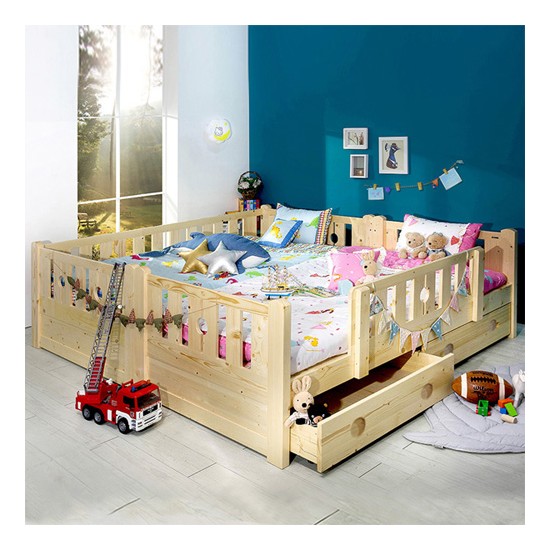 큰아이가 8살이고 평소 어른 침대에서도 떨어지지 않고 잘 자서 서랍만 추가하고 안전가드는 제외했어요. 작은 아이는 안쪽으로 넣고 나란히 재우려구요. 아직 커버랑 이불이 도착하지 않아 날것 그대로의 사진 첨부합니다.